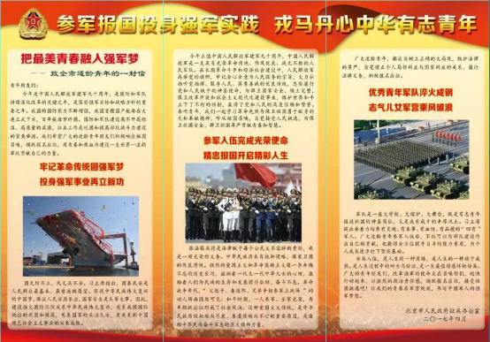 征兵固防、安国兴邦。有志青年从军建功,热血男儿矢志报国。学生们积极响应国家征兵号召,作为大兴区入伍新兵人数最多的单位,最终入伍人数32人,既充分展现了有志青年从军报国的爱国情怀,也用实际行动践行了国家强军战略,为实现强军梦做出了自己的贡献。