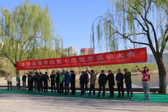 首都高等学校第七届徒步运动大会正式开幕,领导及到会嘉宾集体鸣枪发令,徒步正式出发,选手们绕着清澈的湖泊行走九公里,感受春天的和煦与明媚。