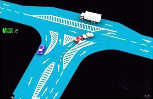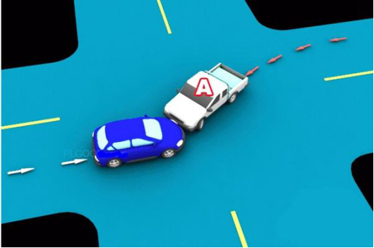 3、通过没有交通信号灯控制的路口时,遇相对方向来车,左转弯车未让直行车先行的,图中所示为A车负全责。