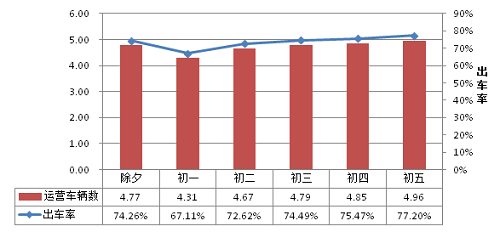 图6 春节假期前六日出租汽车运营车辆数及出车率