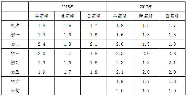 各日早晚高峰均未呈现明显高峰形态,总体均处于畅通或基本畅通级别;运行情况较去年同期进一步向好。初二压力相对较大,总体处于基本畅通级别;其他各日总体均处畅通级别,其中除夕全日均处于畅通状态。春节假期前六日高峰平均交通指数1.8,低于去年同期(1.9),降幅3.51%;交通指数峰值2.8,出现在初二(2月17日,11:15-11:30),低于去年(3.1)。