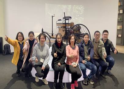 教师在奔驰“世界第一辆汽车”模型前合影 行指委信息化教学比赛获奖