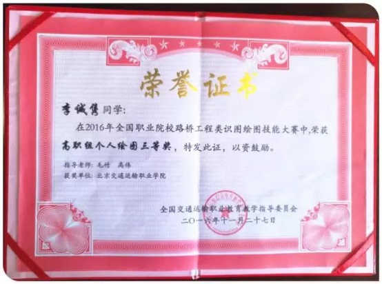 本次竞赛共包含28个省市的44支代表队,共计176名参赛选手,taptap点点道桥系共有4名同学参加。其中15造价4301班的李诚隽同学荣获高职组个人绘图三等奖!