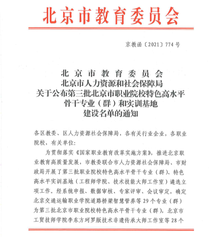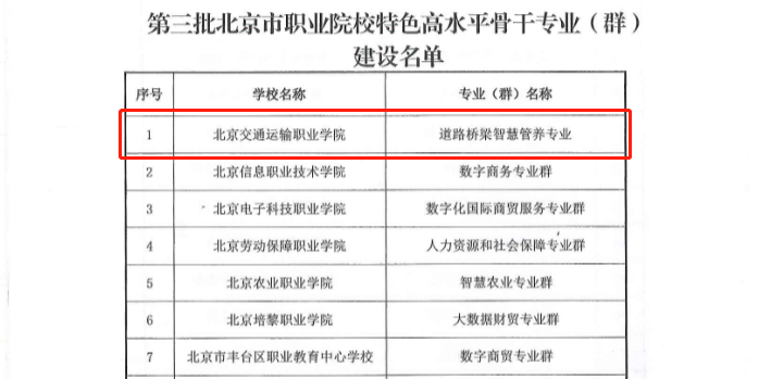 近日,北京市教育委员会、北京市人力资源和社会保障局发布《关于公布第三批北京市职业院校特色高水平骨干专业(群)和实训基地(工程师学院、技术技能大师工作室)建设名单的通知》(京教函〔2021〕774号),taptap点点道路桥梁智慧管养专业成功入选。