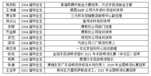 贾会军,2004届毕业生,三元桥丰田汽车销售服务有限公司钣喷中心漆工车间主管兼钣喷中心分公会主席
