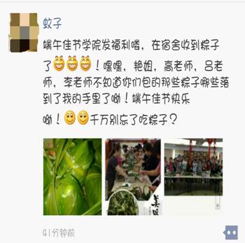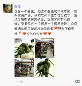 为了让不能回家过端午节的学生吃上粽子,比赛结束后,老师们纷纷留下来继续包粽子,由后勤服务中心负责煮好,学生处通过学生公寓将煮好的粽子分送给留宿的学生们,充分体现了“一颗粽、一颗心,一粒米,一份情”的人文关怀,送出的粽子温暖了所有学生的心,收到粽子的学生们感受到了学院和老师对学生的爱,享受这些饱含了浓浓甜蜜与关爱的粽子。