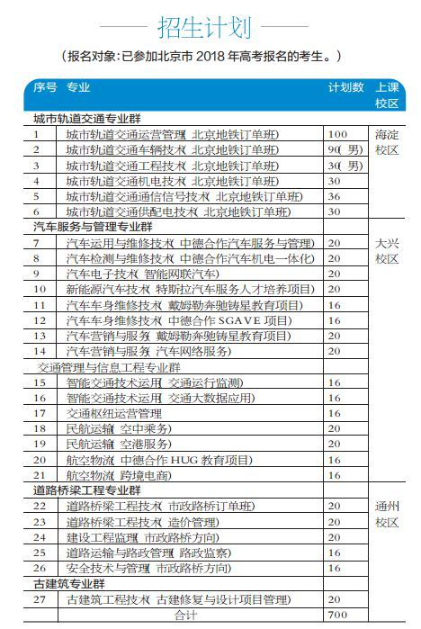 学院今年自主招生有700人计划,27个专业。涉及城市轨道交通专业群、汽车服务与管理专业群、交通管理与信息工程专业群、道路桥梁工程专业群和古建筑专业群等五大专业群,共涉及20多个专业,就业岗位覆盖交通行业主要领域和部门。学院专注交通行业,所以在交通领域就更专业。