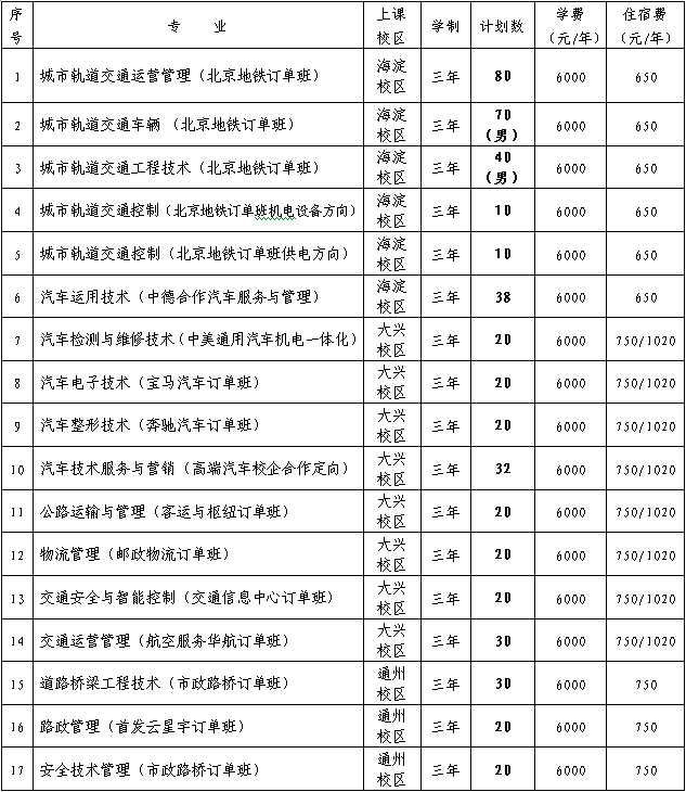 备注: 1、要求报考城市轨道交通专业、汽车整形技术专业、交通运营管理(航空服务华航订单班)考生双眼无色盲、色弱或弱视。