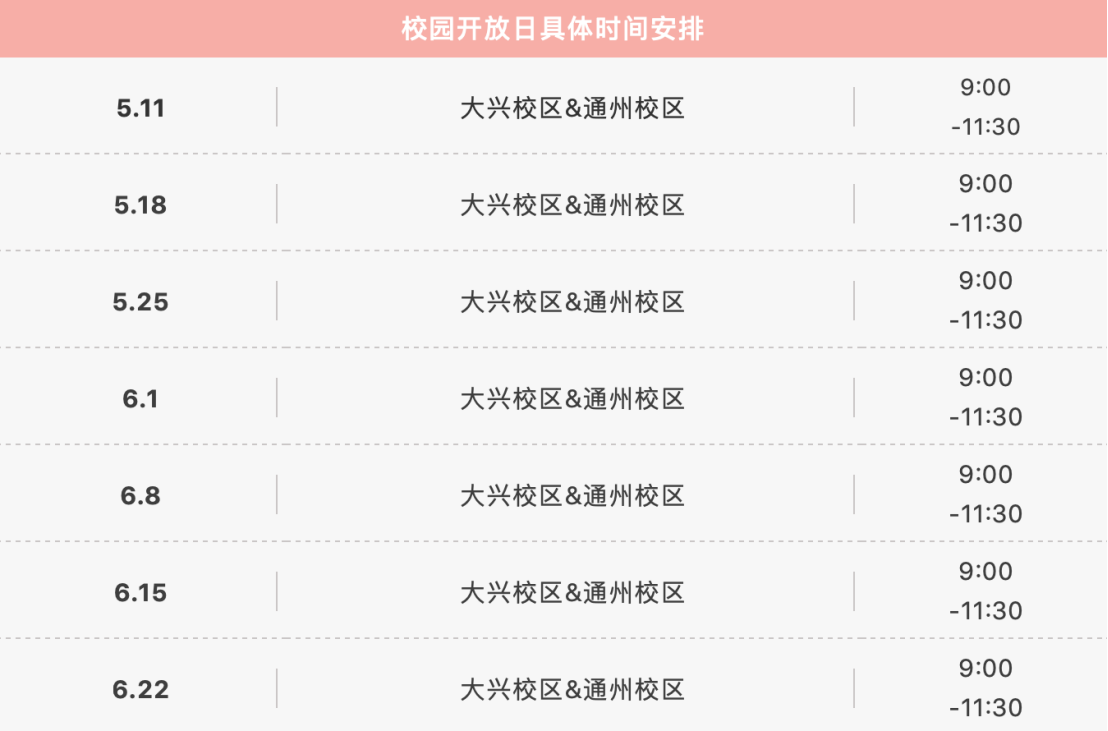 中招校园开放日时间是5.11起至6月每个周六大兴和通州校区开放