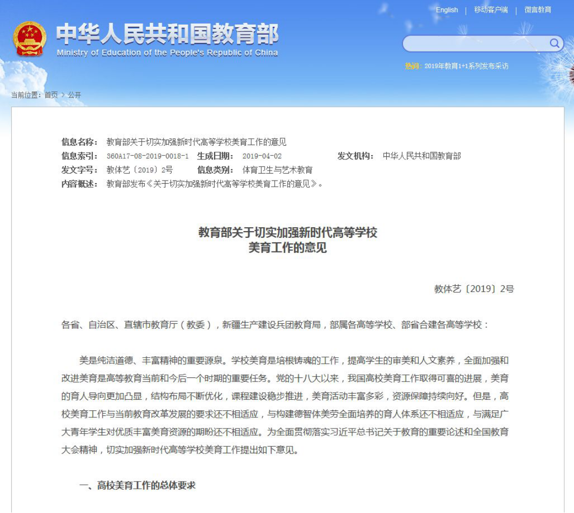 教育部印发《关于切实加强新时代高等学校美育工作的意见》,对新时代高校美育改革发展提出明确要求,使高校美育工作有据可循、有规可依,为构建德智体美劳全面培养的教育体系,形成更高水平的人才培养体系提供重要保障。