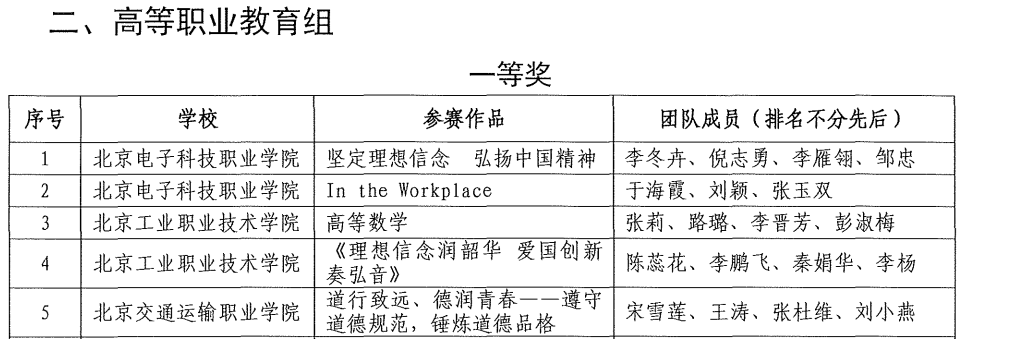 2022年10月,北京市职业院校技能大赛教学能力比赛顺利结束,北京市教委发布《北京市教育委员会关于公布2022年北京市职业院校技能大赛教学能力比赛获奖结果的通知》,taptap点点体育九支团队全部获奖,共获得五个一等奖,四个二等奖。其中,思政部宋雪莲教师团队再次问鼎金奖,在此次比赛中荣获高职“公共基础组”一等奖。这已是思政部连续三年参加此项赛事并连续三年获得一等奖且进入国赛选拔赛。
