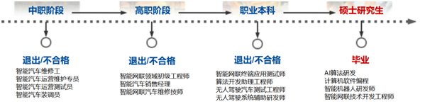 本项目旨在培养智能网联汽车应用型技术人员,根据培养路径,提供中职、高职和本科就业平台。具体见职业发展路径图。