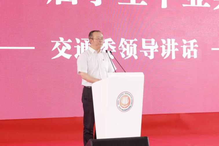 市交通委领导郭卫亮讲话,首先为同学们的自信和阳光点赞,肯定了学院一年来取得的丰硕成果,为北京交通行业未来发展提供充足的人才储备。他要求同学们不忘初心,坚定信仰,牢记使命,勇往直前,脚踏实地,通过努力建设人民满意的交通。