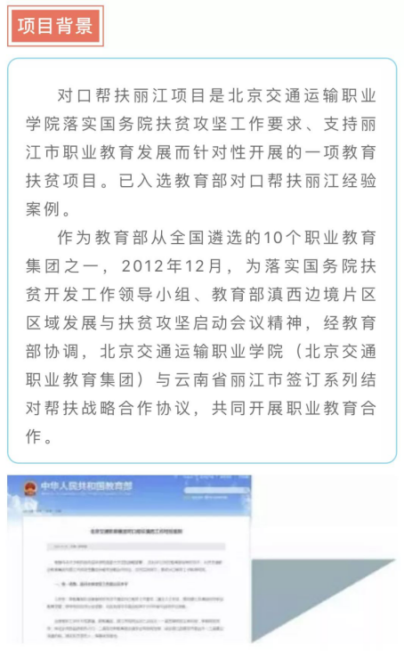 对口帮扶丽江项目以人才扶贫为主,重点开展两项帮扶工作:面向家庭贫困学生定向招生,提供来京接受免费职业教育的机会,帮助他们获得职业发展机会,带动家庭脱贫致富;面向对口帮扶地区职业学校的专业教师、校长和管理人员开办培训班,帮助他们来京学习、挂职锻炼,提升管理水平和开展职业教育的能力。