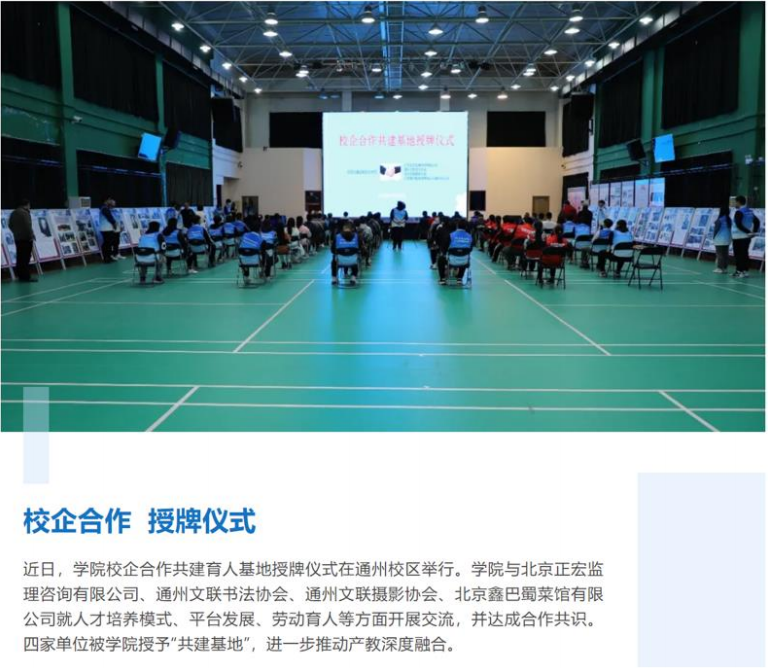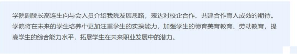 高连生副院长代表学院向四家校企合作共建育人基地单位代表授牌。学院将与各 单位在实习、礼仪文化、艺术创造等方面开展深入、全面的合作,创新校企合作模式, 培育德智体美劳全面发展的综合型人才。