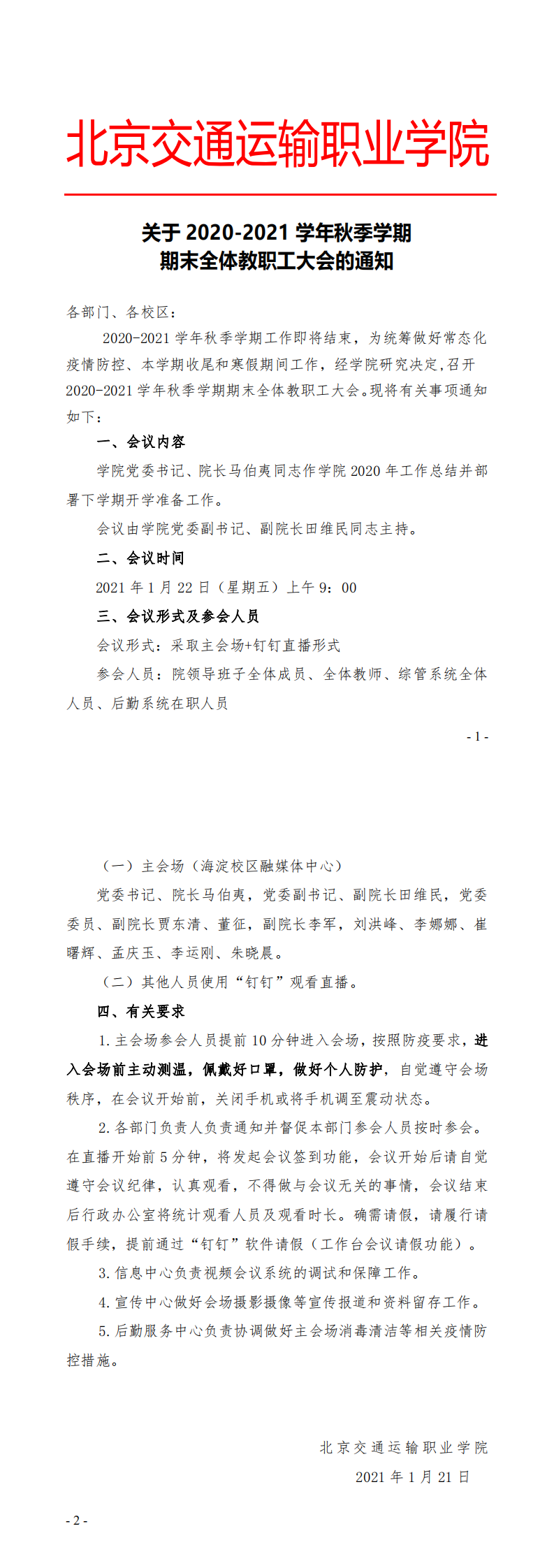 关于2020-2021学年秋季学期期末全体教职工大会的通知