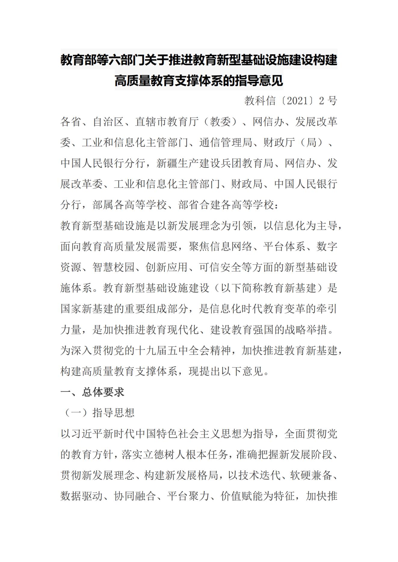 转发《教育部等六部门关于推进教育新型基础设施建设构建高质量教育支撑体系的指导意见》