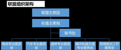 设立联盟主席团。联盟最高权利机构,由联盟成员单位各推荐一人(交通职教集团正副董事长或理事长,院校书记或院长)组成,负责领导联盟各项工作,以主席团会议的形式对联盟重大问题进行决策。