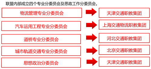 设立专业分委员会及思想政治工作分委员会。分别由天津交通职教集团、上海交通物流职教集团、河北省交通职教集团、北京交通职教集团和天津交通职教集团牵头组建。各专业分委员会主任原则上由院级领导担任。